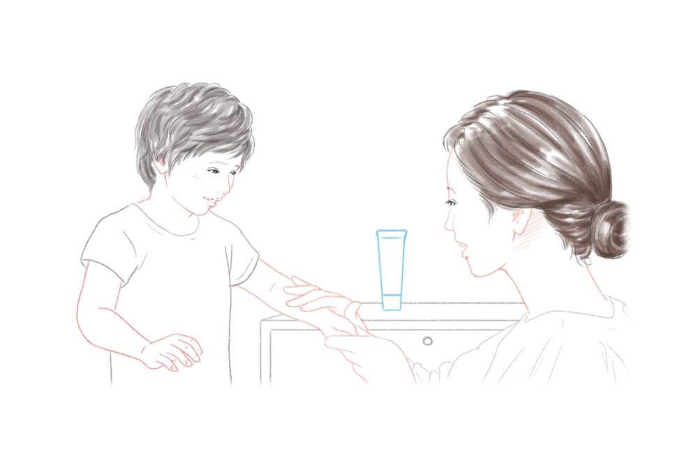 低下している保湿性を補うために、保湿性の高い製品を外用しましょう。外用回数は、1日2回、その内1回は入浴後が効果的です。カサカサ症状が無いように見える部位も含め、全身しっかり保湿しましょう。