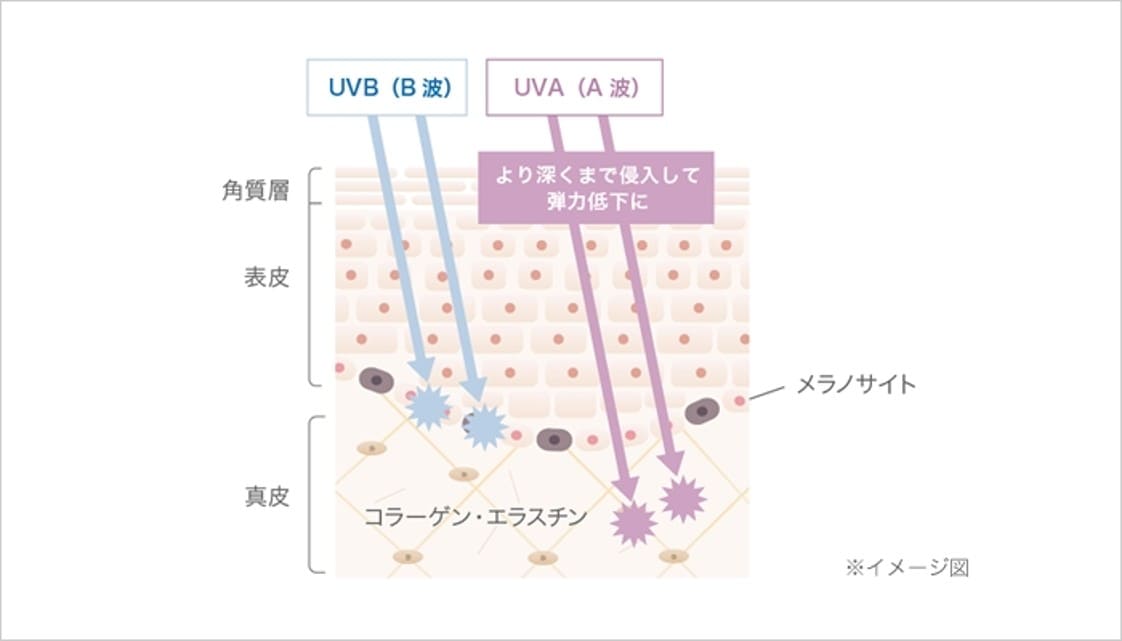 紫外線は皮膚疾患を悪化させるだけでなく、シミ・シワ・たるみといった光老化や皮膚がんのリスクを高めます。UVBは表皮に届きシミの原因となり、UVAは真皮に届きシワ・たるみの原因となります。