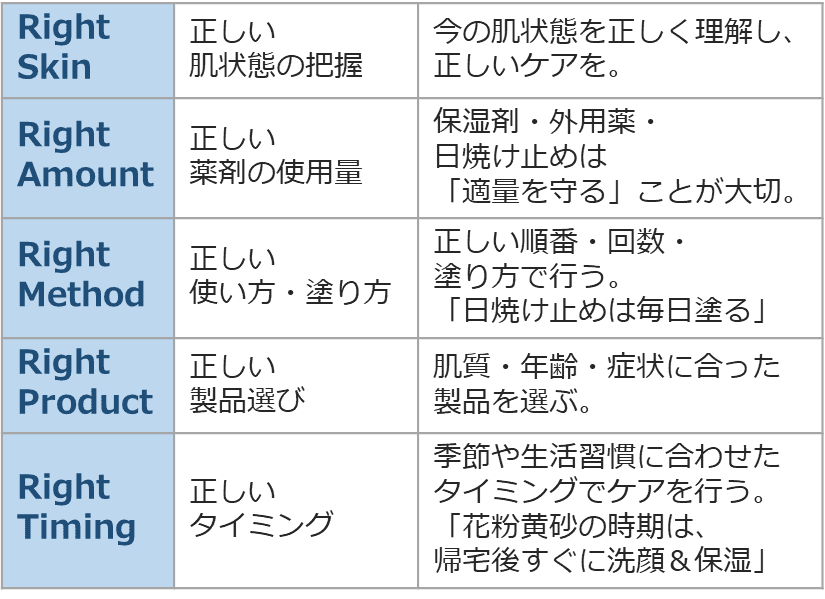 Right Skin 正しい肌状態の把握 今の肌状態を正しく理解し、正しいケアを。 Right Amount 正しい薬剤の使用量 保湿剤・外用薬・日焼け止めは「適量を守る」ことが大切。 Right Method 正しい使い方、塗り方 正しい順番・回数・塗り方で行う。「日焼け止めは毎日塗る」 Right Product 正しい製品選び 肌質・年齢・症状に合った製品を選ぶ。 Right Timing 正しいタイミング 季節や生活習慣に合わせたタイミングでケアを行う。